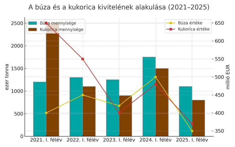A búzaexport 2020-ban még 3,1 millió tonnát tett ki, 2021-re azonban 2,6 millió tonnára csökkent. A következő évben, 2022-ben tovább esett, és mindössze 2,1 millió tonna búza hagyta el az országot, ami az elmúlt öt év legalacsonyabb értéke volt. 2023-ban megindult a helyreállás, ekkor 3,0 millió tonna búzát exportált Magyarország, 2024-ben pedig már elérte az 3,9 millió tonnát, ami az öt év legmagasabb szintjének számít. A 2025-ös év első felében azonban ismét erős visszaesés következett: mindössze 1,3 millió tonna búza került külpiacra.