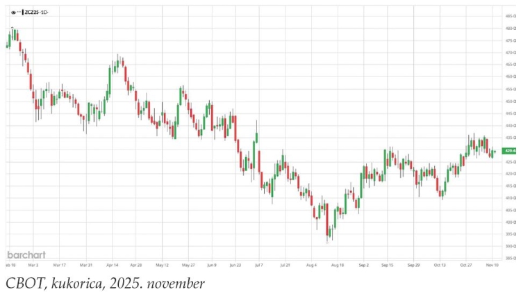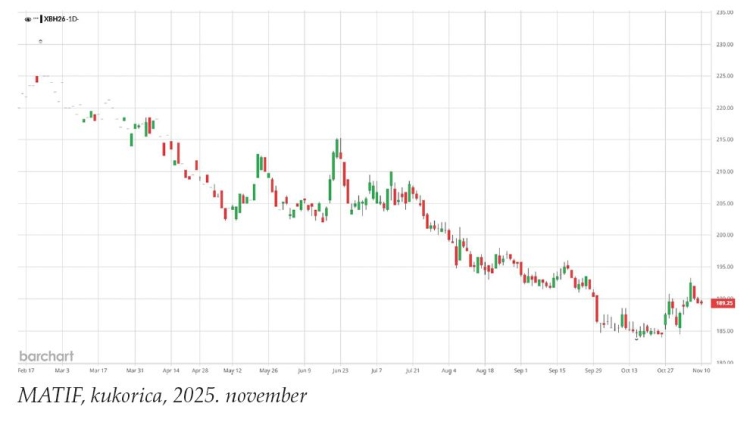 Európában továbbra is vegyes képet láthatunk: az alacsony, 60 millió tonna alatti termés és a vetésterület várható további csökkenésének (cca. 8,4 millió hektár) eredményeként az EU kukoricapiaca fokozottan kitett a globális ármozgásoknak, piaci anomáliáknak és esetleges sokkoknak. Míg a készletek tovább fogynak, az import egyre dominánsabbá válik, az árak azonban az elmúlt évek tükrében alacsonyabb szinteken stabilizálódnak. November első hetében a MATIF (párizsi árutőzsde) kukorica és búza határidős jegyzései közötti árkülönbözet (spread) 6 euró/tonna körül alakult, amely kifejezetten alacsony értéknek tekinthető. Az árkülönbség eróziójának egyik fő oka lehet a kínálat oldali nyomás, továbbá az a tény, hogy egyelőre a keresleti oldalon sem látszik érdemi fordulat. Értelemszerűen ezek a tényezők az EU gabonapiacán jelentős hatással lehetnek a jövőbeli vetésszerkezetre és az inputigényekre egyaránt.