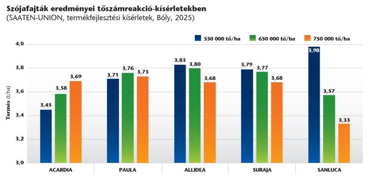 A SAATEN-UNION a hazai viszonyokra, a helyben megfogalmazódó termelési szempontokat figyelembe véve állítja össze szójaajánlatát. Ennek érdekében a termőképesség megcélzását alapvetőnek tekintjük. Ugyanakkor cégünk a nemesítés és a hazai körülményekhez illeszthető fajták kiválasztása során kiemelt figyelemmel tekint az alkalmazkodóképességre, termésstabilitásra, kedvező érési és beltartalmi tulajdonságokra és a veszteségektől mentes betakaríthatóságra is. Ezek az agronómiai szempontból meghatározó tulajdonságok hozzájárulnak napjaink korszerű, fenntartható és sikeres szójatermesztéséhez. Az elvárt siker érdekében – a szója esetében fokozott elővigyázatossággal, a tapasztalatokra alapozottan – szükséges a gazdálkodóknak a saját adottságaikhoz megtalálni a megfelelőt. A portfóliónkban szereplő fajták széles tenyészidő-intervallumot ölelnek fel, aminek köszönhetően a termőhely fekvésének megfelelően választható ki az, amelyik biztonságosan beérik. Valamennyi portfóliótag korszerű, modern fajta, kifejezetten stabil hozammal.