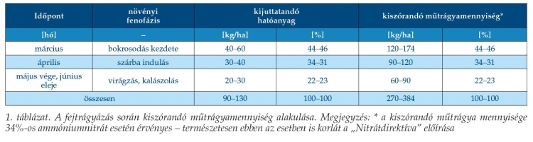 A szakirodalmi adatok szerint az őszi búza fejtrágyázásának időpontjára és a kijuttatott „N”, illetve műtrágya mennyiségre vonatkozó adatokat az 1. táblázat szemlélteti.
