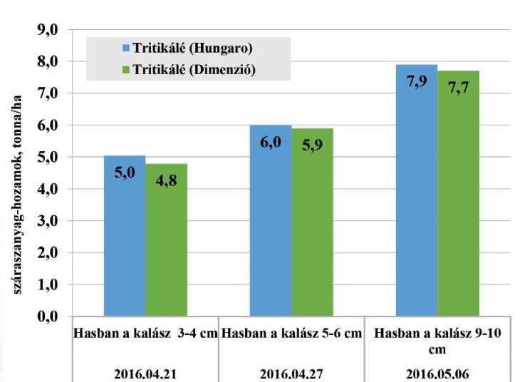 A Kaposvári Egyetem Takarmánytermesztési Kutató Intézetében (Iregszemcsén) 2015. őszén végzett kísérlet során a tritikálé öregedési modelljét vizsgáltuk (betakarítás: 2016. április 21., április 27. és május 6.). A kalászolás előtti állapotban – amikor a kalász még a hasban volt, és 5–6 cm hosszúságot ért el – a terméshozam 6,0 tonna sza./ha (Hungaro) és 5,9 tonna sza./ha (Dimenzió) volt. Ez a szárazanyaghozam 15–20 tonna/ha szilázshozamnak felelt meg, 30–40%-os szárazanyag-tartalom mellett. Egy héttel később, amikor már a rosttartalom és az emészthetőség kevésbé volt kedvező, de még mindig jónak ítéltük, a kalász pedig hasban volt (9–10 cm hosszú, a szálkák már kibújtak, jól láthatóvá váltak), az elért hozam 7,9 tonna sza./ha és 7,7 tonna sza./ha volt. Ez 20–25 tonna/ha szilázshozamnak felelt meg, 30–40%-os szárazanyag-tartalom mellett.