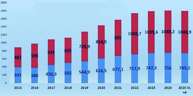 2025-ből az első három negyedévről rendelkezünk adatokkal. Az AKI Pénzügyi Hírlevele szerint a mezőgazdaság hitelállománya 1,8 százalékkal 1040,9 milliárd forintra mérséklődött az előző év azonos időszakához képest. Az élelmiszeripar hitelállománya 3,9 százalékkal 749,2 milliárd forintra nőtt 2025 harmadik negyedévének végére. A tavalyi megtorpanás után ezek nem látványos változások. A 2025 év végi számokban hasonló mértékekre számítok, miközben ebben az évben felfelé való elmozdulás lesz a beruházások meglendülésével, szép fokozatosan. A mezőgazdaság beruházásai ebben az időszakban az előző év azonos időszakának szintjén voltak (4929 milliárd Ft). Mindez azt jelzi, hogy szektor szinten a pénzügyi helyzet stabil. Ha viszont az átlag mélyére tekintünk, széles szakadást látunk. A mezőgazdasági vállalkozások jelentős része romló likviditással és jövedelmezőséggel küzd.