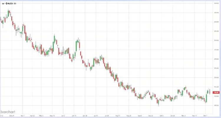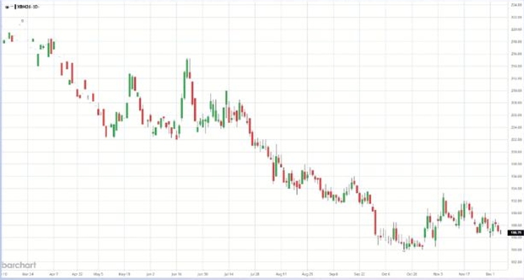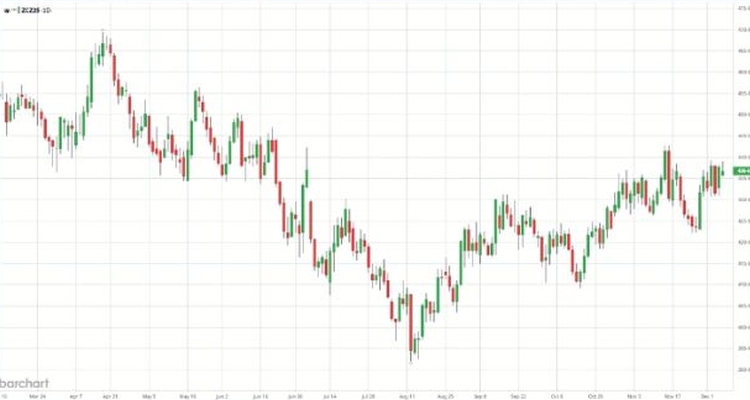 Amennyiben az árak alakulását vizsgáljuk, a fenti termésmennyiségekből fakadó kínálati nyomás vált domináns tényezővé. Bár az IGC (International Grains Council) kukorica árindexe novemberben 3 százalékkal erősödött, a szint továbbra is jelentősen elmaradt a 2022/23-as csúcsoktól. A CBOT (Chicago Board of Trade) fronthavi jegyzése az elmúlt hetekben 430–440 USDc/bushel sávban oldalazott.
