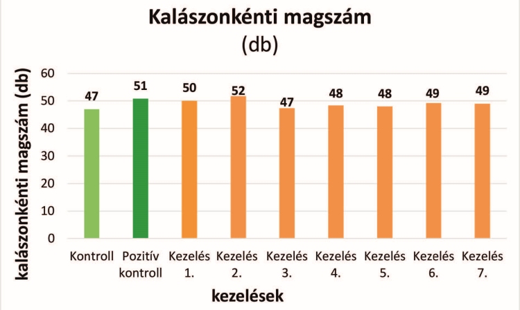 A kalászonkénti magszám alakulása jól mutatja, hogy a növény milyen mértékben tudta hasznosítani a rendelkezésre álló tápanyagokat. A kontrollhoz képest több kezelésben is magasabb értékeket mértek, a legjobb eredményt a 2. kezelés adta. A nagyobb magszám arra utal, hogy a növény kedvezőbb körülmények között alakította ki a termésképző szerveket, ami a mikrobiológiai készítmények által javított tápanyag-ellátottságnak és gyökérfejlődésnek is betudható (1. grafikon).