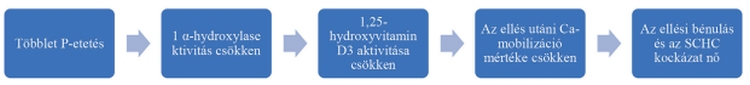 Az ellés előtti túlzott P-ellátás pedig összefüggésbe hozható a kalciumanyagforgalom zavaraival az ellés körüli időszakban. A magas P-bevitel gátolja a vese enzim aktivitását, csökkentve az 1,25-dihidroxi-D3-vitamin (kalcitriol) szintézisét, amely elengedhetetlen a Ca felszívódásához és mobilizációjához. Ennek következtében az ellés előtti előkészítő időszakban túlzott P-ellátásban részesülő teheneknél romlik a csontokból történő Ca-mobilizáció, ami növeli a szubklinikai hipokalcémia és az ellési bénulás kockázatát.